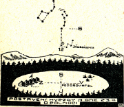 Odhad času podle hvězd. Najděte si Velký vůz a Polárku. Spojte jeho první hvězdu (na začátku oje) s Polárkou a přímku prodlužte na druhou stranu. Přijdete k souhvězdí tvaru W, to je Kassiopea. Přímka spojující Polárku s hvězdou B v souhvězdí Kassiopeiy je ručičkou hodin o 24 hodinách. Stojí-li svisle (Kassiopea je nahoře), je 24 hodin hvězdného času. Je-li Kassiopea v pravo, je 6 hodin, dole je 12 hodin, je-li v levo, 18 hodin.