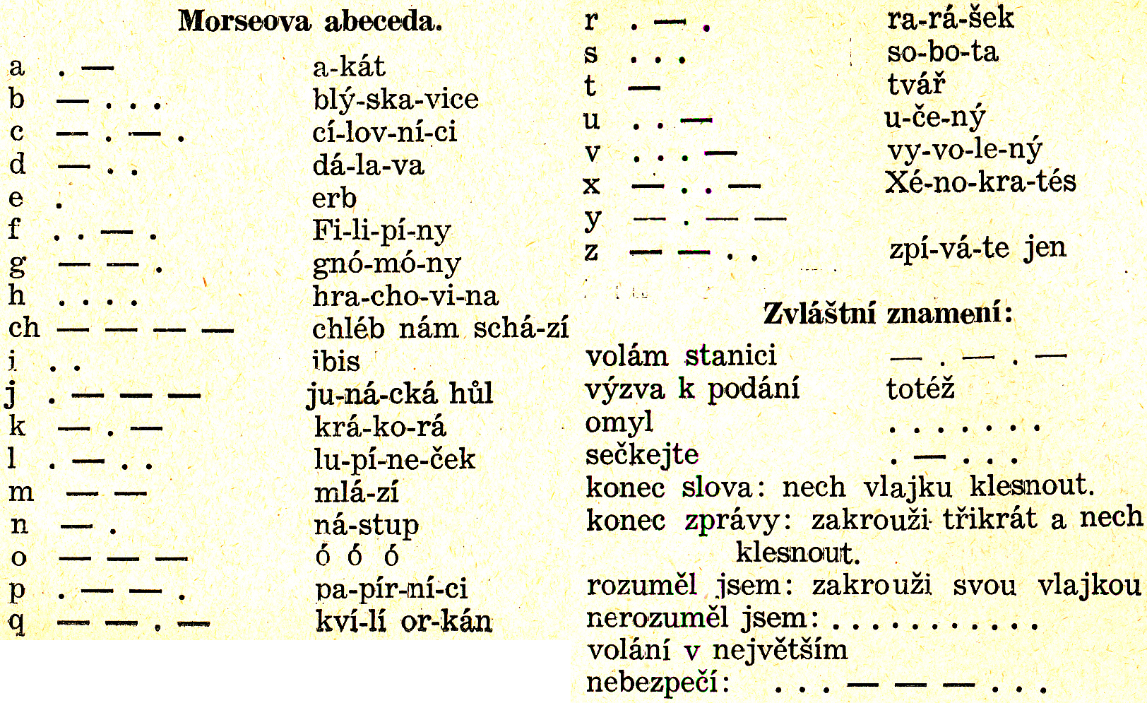 Pomocná slova jsou pro první dobu, cviku nabudou častým čtením a psaním vět v značkách. Při psaní dělej za písmenem šikmou čárku, za slovem dvě, za větou tři. Posílej hochům takto psané zprávy, diktuj na schůzce věty, udělej závody ve čtení vět, značkami napsaných. Když to ovládají, sáhni k vlajkám. Nauč je správně držet vlajku, mávat, aby se neshrnovala (viz obrázky v Z.). Pak rozděl na skupiny po třech (jeden signalisuje, druhý čte, třetí zapisuje cizí depeše), vysvětli postup, pošli aspoň na 300 kroků od sebe a ať prakticky zkouší se dorozumět. Nekřičet na sebe.